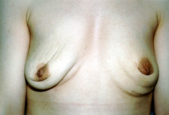 The photograph below shows a 29-year-old woman 1 year after having her silicone gel-filled breast implants removed, but not replaced. Women with large breast implants, especially those inserted on top of the chest muscles (subglandularly), may have major cosmetic deformity if they choose not to replace them or to undergo additional reconstructive surgery.